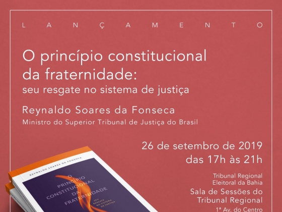 A Associação dos Juízes Federais do Brasil (Ajufe) convida os (as) associados (as) para o lançamento da obra “O princípio constitucional da fraternidade: seu resgate no sistema de justiça” de autoria do ministro do Superior Tribunal de Justiça (STJ), Reynaldo da Fonseca, no Tribunal Regional Eleitoral da Bahia, na próxima quinta-feira (26/9), a partir das 17h.