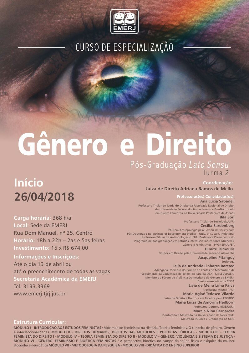 A Escola da Magistratura do Estado do Rio de Janeiro (EMERJ) informa que está com as matrículas abertas até 13/4, sexta-feira, para a segunda turma do curso de especialização “Gênero e Direito”, na modalidade pós-graduação Lato Sensu. Mais informações podem ser acessadas no folder abaixo ou obtidas por meio do telefone 21 3133-3369 ou do site www.emerj.tjrj.jus.br.