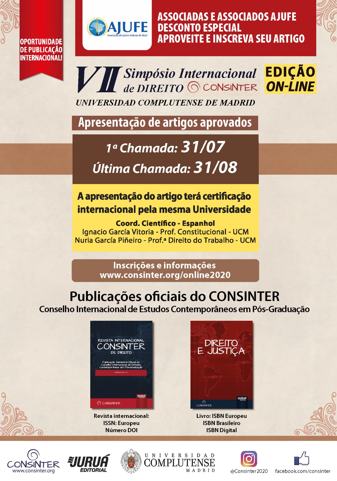 O “VII Simpósio Internacional de Direito Consinter 2020” conta ainda com a coordenação acadêmica do ex-presidente da Ajufe e representando a Universidade de Coimbra, Antônio César Bochenek, e a coordenação científica é de responsabilidade da Universidad Complutense de Madrid representada pelos professores Ignacio Garcia Vitoria e Nuria Piñero.