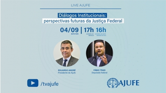 Dando continuidade ao Webinar Diálogos Institucionais – Perspectivas Futuras da Justiça Federal, a Ajufe promove nesta sexta-feira, 04 de setembro, às 17h (horário de Brasília) e 16h (fuso do Mato Grosso do Sul), uma live com o deputado Fábio Trad (PSD/MS). O debate, que conta também com a participação do presidente da Ajufe, Eduardo André Brandão, será transmitido, ao vivo, no canal da associação no Youtube.