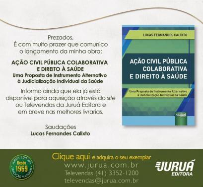 O juiz federal Lucas Fernandes Calixto (Substituto na 1ª Vara Federal de Pelotas) lançou, na semana passada, a obra “Ação Civil Pública Colaborativa e Direito à Saúde - Uma Proposta de Instrumento Alternativo à Judicialização Individual da Saúde”, pela Editora Juruá. O livro é resultado de sua dissertação de mestrado na Universidade Federal de Pelotas (UFPEL).