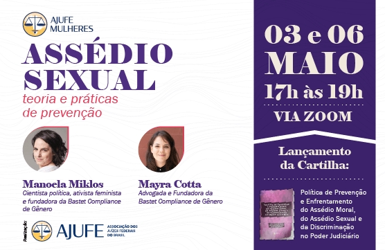 A Comissão AJUFE Mulheres, grupo da Associação dos Juízes Federais do Brasil (Ajufe) composto magistradas e magistrados federais, realiza nos dias 3 e 6 de maio, a partir das 17h, um curso com dois encontros para debater "Assédio sexual: teoria e práticas de prevenção". As inscrições estão abertas pelo link: https://bit.ly/3uJuo4w.
