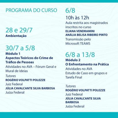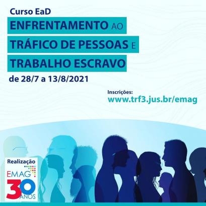 No dia 30 de julho, haverá uma aula aberta introdutória voltada ao público em geral. A programação e as inscrições estão disponíveis no site: https://www.trf3.jus.br/emag/cursosemag/cursos-2021/enfrentamento-ao-trafico-de-pessoas-e-trabalho-escravo-ead/