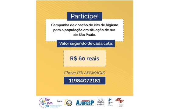 A Ajufe comunica a realização da campanha de doação de kits de higiene às pessoas em situação de rua de São Paulo. Os mantimentos serão entregues durante a 2ª edição do “Mutirão Pop Rua Jud Sampa”, que acontece entre os dias 21 e 23 de novembro, na Praça da Sé (SP).