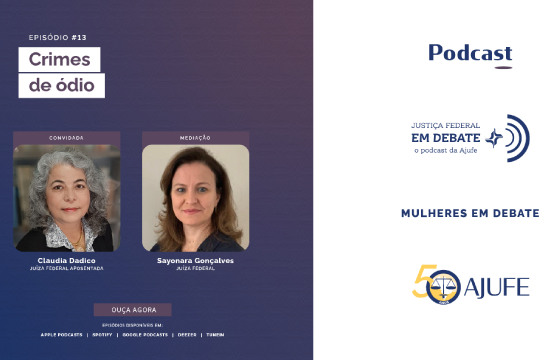 O quadro "Mulheres em Debate", produzido pela Comissão Ajufe Mulheres, no Podcast da Ajufe "Justiça Federal em Debate" está de volta! Neste episódio, a juíza federal Sayonara Mattos entrevista a juíza federal aposentada Claudia Dadico sobre crimes de ódio. Juntas, as magistradas falam sobre a necessidade das novas abordagens sobre o ódio e o olhar frente a esse problema a partir dos elementos do estado moderno.